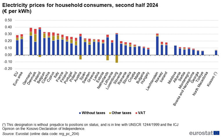 Das ist schon interessant. Aus ihrem Balkendiagramm geht hervor, dass Österreich trotz der kostenlosen Belieferung unseres Landes durch die Sonne die vierthöchsten Energiepreise Europas zu verzeichnen hat, nämlich 30 Cent per kWh plus 5 Cent per kWh für "other taxes". In Georgien und der Türkei bekommt man für 6 Cent die kWh den gesamten Strom! Wie kommt denn das?